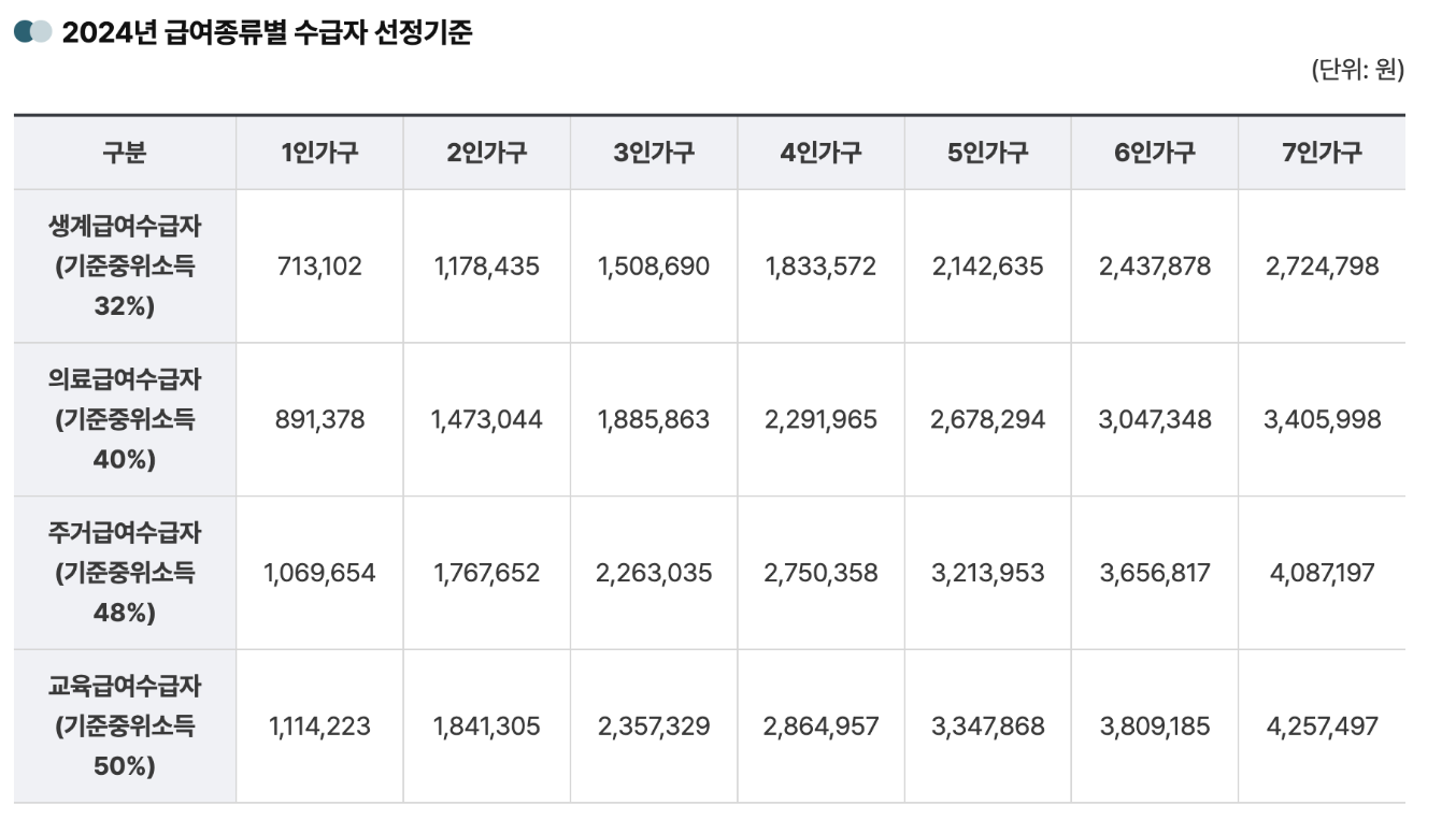 즉, 가구의 소득이 이 기준을 충족해야 급여를 받을 수 있습니다. 각 급여의 기준 금액을 표로 정리해보면 아래와 같아요.